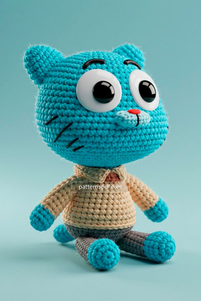 For those eager to recreate this lovable character, embarking on a Gumball Watterson Amigurumi project offers a rewarding and fun challenge. While a specific pattern isn’t provided, observing the image reveals the intricate shaping and color work involved. The head and body are likely worked in continuous rounds of single crochet, forming his distinct cartoonish proportions. The appeal lies in perfecting his unique features: the prominent ears, the large, wide-set eyes (possibly large safety eyes or crocheted whites with embroidered pupils), and the color changes required for his sweater and pants. Adding the small red nose and embroidered whiskers will truly bring Gumball’s expressive face to life, allowing crocheters to stitch their way into the amazing world of Elmore.